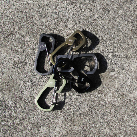 本体素材にアルミニウムを使用したCIEオリジナルカラビナです。素材にアルミニウムを採用する事で軽量でありながら錆びにくいという特性があります。フレーム部分は一体成型によりなめらかな仕上がりとなっております。厚みのあるアルミニウム板を型抜きしエッジ部分を研磨し、仕上げにアルマイト塗装を施したミリタリーライクなオリジナルカラー展開となっております。構造は1つのゲートで2室となっており、下層部は鍵など抜けにくい構造となっております。