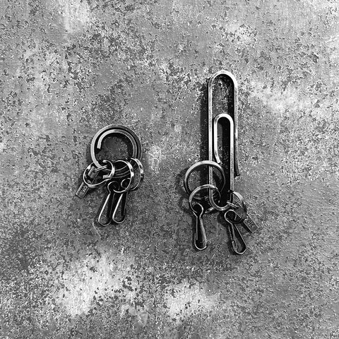 本体に真鍮素材を使用した大阪の町工場の職人技による真鍮材の曲げにフォーカスした、CIEオリジナルキーホルダーシリーズです。細長いクリップ型と指に引っ掛ける丸型のキーリングの2型展開で、2重リングやナスカンなどが付属しており、使い勝手の良いブラス製キーホルダーになります。 2㍉厚5㍉巾の真鍮平角線を裁断し角を面取り、ナマシ加工(切削材仕様の為、強い力が加わると割れてしまうための工程、熱を加えて柔らかくする)をし刻印、バレル加工後、専用金型で曲げ加工後仕上げバレルを施しております。キーリング式なのでベルトループやバッグ等に取り付けて使用する事ができます。