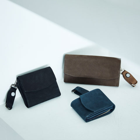 本体レザーにはポルトガル、ヴィーラ・モレイラ地方にある1968年創業のタンナー『 CurtumesIbériaS.A 』のレザーを採用。ヨーロピアンブルの原皮を使用したヌバック型押しレザーはクロム鞣し染料仕上げとなっており、柔らかな手触りで経年変化を楽しめる上質なレザーとなっております。また付属キーリングはDURAFLEX社製のリフレクターホックを使用しております。