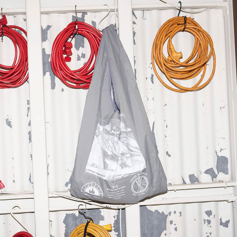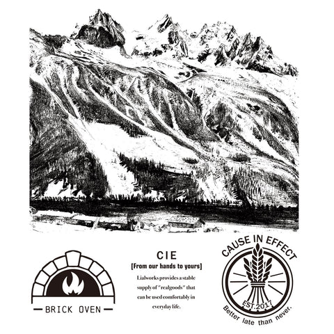 プリントデザインはスイスアルプスの山麓にある歴史あるベーカリーストアのマーケットバッグというフィクションでのグラフィックとなります。マーケットバッグは内装のポケットに折り畳む事でパッカブルとなりコンパクトに持ち運び頂けます。