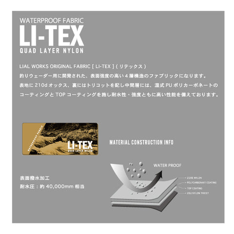 本体生地には、CIE オリジナルファブリック <LI-TEX> を使用。210d オックスナイロンを表面に4層で構造された 高機能素材になります、表面に弱撥水加工、防水性を備えております。ブランドタグには YKK 社製のクイックロ ンにエンボス樹脂加工でブランドロゴをプリントしたものをアクセント、タグの下生地には 600d ポリエステルの ベースにポリウレタンコーティングを使用した生地を使用しております。ZIP につきましては、メインにはビスロ ンファスナーに撥水剤にどぼ漬けした YKK 社製の VISLON<WATER-R> を使用しており、スムーズな開閉性と持続 性の高い撥水性を持っております、メイン以外にはコイルの裏使いの <WATER-R> を使用しており、ファスナー全 体的に撥水性を持たせております。釣りウェーダー用に開発されたベースの生地にフィッシングベストのディ ティールをイメージに作成したブランドタグでフィッシングイメージに仕上げたアイテムです。マチなしでスリムな形状でありつつ、つまみでボリュームを少し出したデザインとなっております。